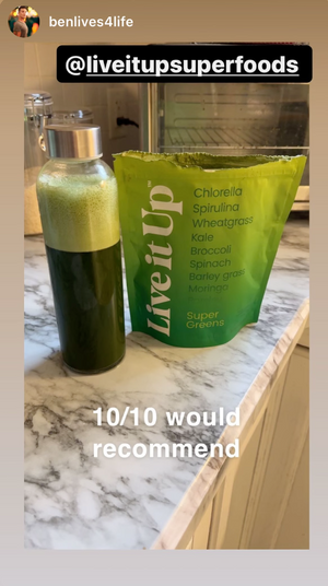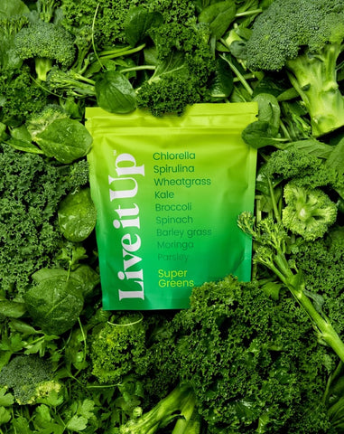 A pouch of Live it Up Supergreens set against a backdrop of lush green whole food ingredients