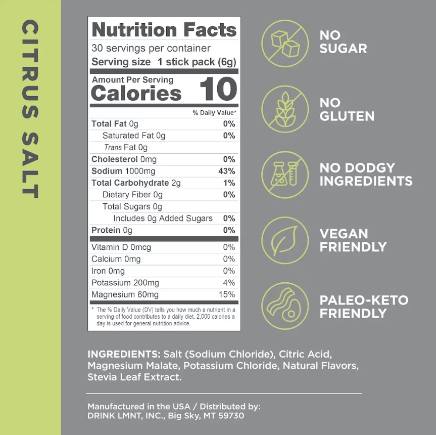 - Key ingredients: Salt (1000mg), citric or malic acid, magnesium malate, potassium chloride, natural flavors, and stevia.