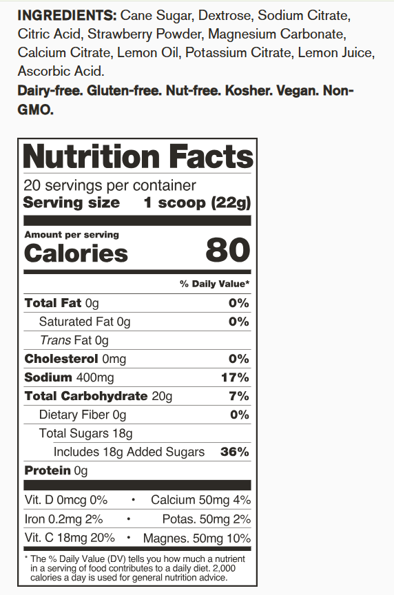 Skratch Labs sells energy chews, energy bars, recovery drink mixes, and four hydration products, including Hydration Sport Drink Mix, as well as an unsweetened version with no sugar or sweetener (this is a more recent offering). One serving of the Strawberry Lemonade flavor contains:Â