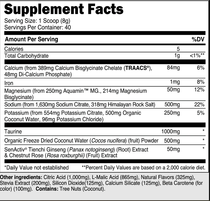 - Taurine, SenActiv®, and coconut water: Help support hydration and athletic performance. Because of the inclusion of taurine, talk with a healthcare provider if you are taking any prescription medications.