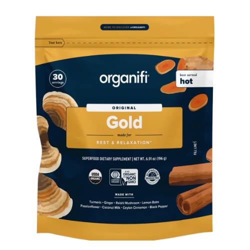 That brings me to Organifi Gold, a variation of the traditional Ayurvedic golden milk latte. Formulated to support restful sleep, healthy digestion, and overall relaxation, this blend combines superfoods, botanicals, functional mushrooms, adaptogens, and prebiotics, including turmeric, reishi extract, cinnamon bark, ginger root, and black pepper extract. It also provides trace amounts of essential minerals like iron, potassium, and magnesium.