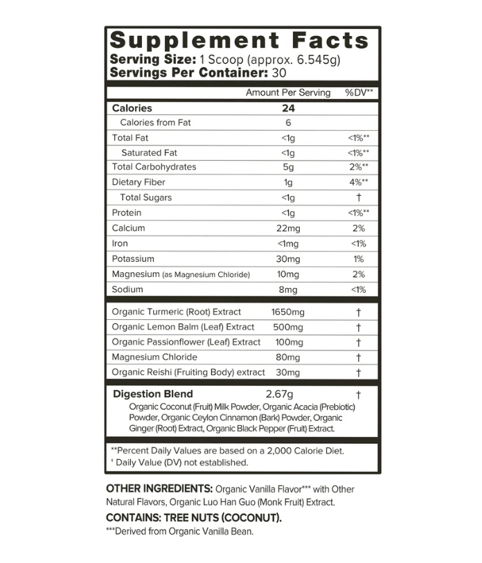 Organic Turmeric, Organic Lemon Balm, Organic Passionflower, Magnesium Chloride, and Organic Reishi