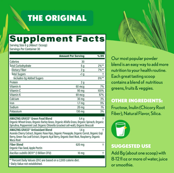 The Amazing Grass greens blend is a great nutrition source thanks to its fiber, mineral, and antioxidant content.Â