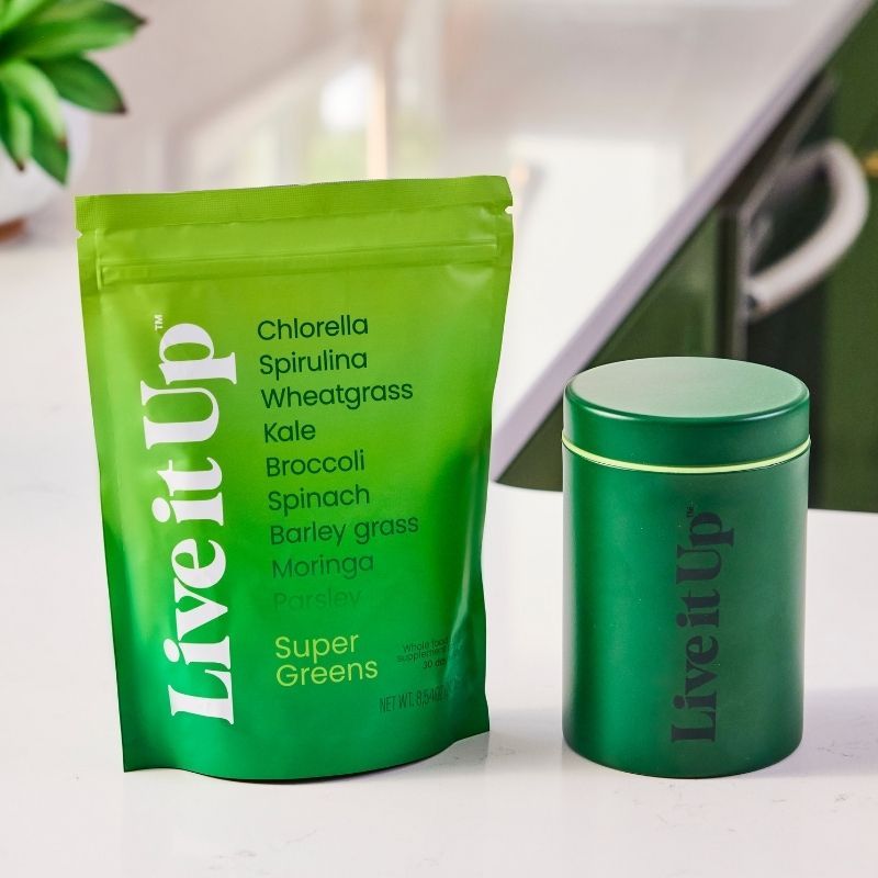 • Get Your Greens In! Consider trying high-quality greens powders to support your nutrition, like Live it Up Super Greens, which contains over 20 superfood ingredients, organic vegetables, digestive enzymes, and probiotics, without added sweeteners, artificial ingredients, or fillers.