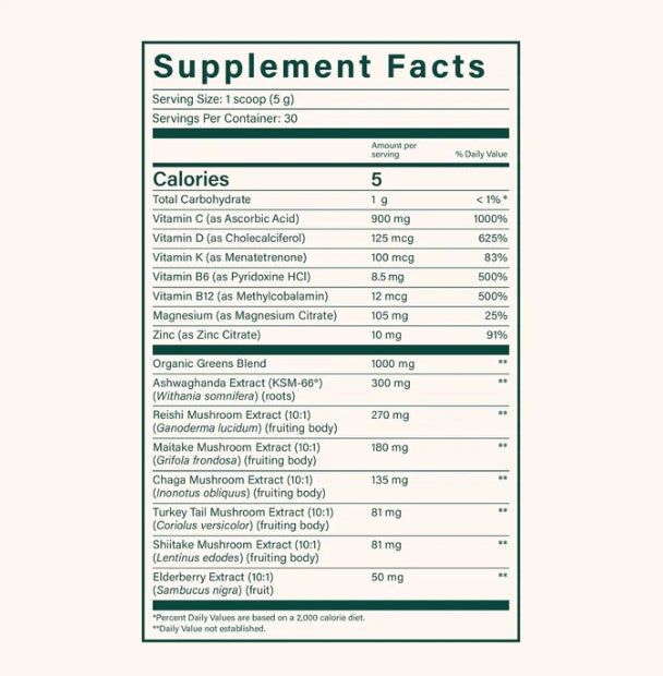 - Mushroom blend (747 mg): Reishi, chaga, turkey tail, maitake, and shiitake mushrooms.