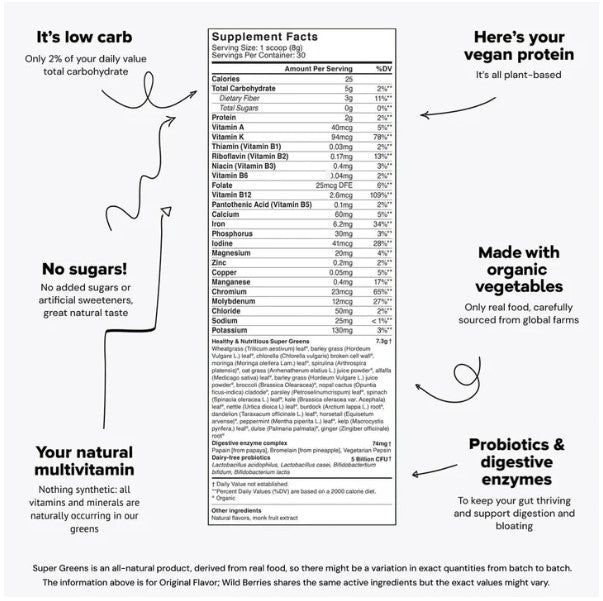 - Energy Levels: Super Greens helps sustain energy levels through its adequately dosed inclusion of iron (35% of DV), zinc, magnesium, and essential B vitamins like B12 and B6. The rich nutritional profile of cereal grasses also supports energy production. Barley grass juice may also help maintain energy.