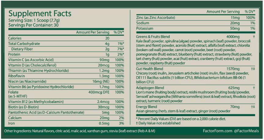 In late 2024, Factor launched Factor Form, a subscription-only supplement brand featuring a greens powder, whey protein powder, and electrolyte powder. Factor Form Daily Greens, which appears to be modeled after AG1, is delivered every four weeks in a box containing 30 single-serving packets, or 60 packets for a double order.