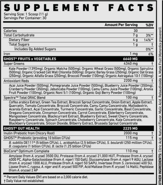 - Gut Health: Ghost Greens does appear to provide comprehensive gut support. Ten billion CFUs of probiotics, 110mg of digestive enzymes, and 4g of dietary fiber including the prebiotic inulin—it's all there.