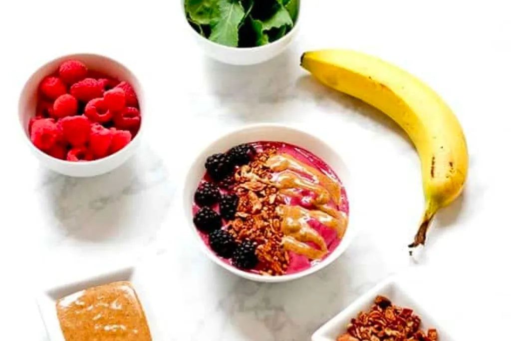 When making a healthy smoothie bowl, you want to include natural ingredients such as raw or frozen no-sugar-added fruit, unsweetened non-dairy milk or water, greens, and sugar-free, plant-based protein powder. If you're adding yogurt, be sure it contains no added sugars.