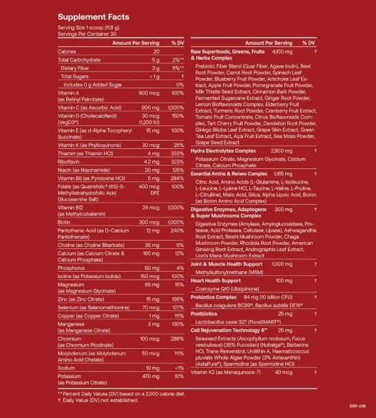 - Loaded with superfoods, greens, fruits, herbs, essential vitamins, digestive enzymes, and pre- and probiotics