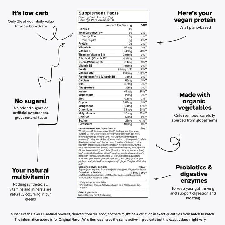 - Balanced Energy: Super Greens may help maintain a healthy metabolism and support cognitive function thanks to the inclusion of B vitamins such as B1, B2, B3, B6, and B12 (109% DV), plus magnesium and iron (34% DV).
