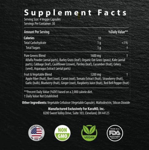 KaraMD claims that Pure Nature is a blend of 100% natural fruits, vegetables, and greens. The supplement also includes several additives.