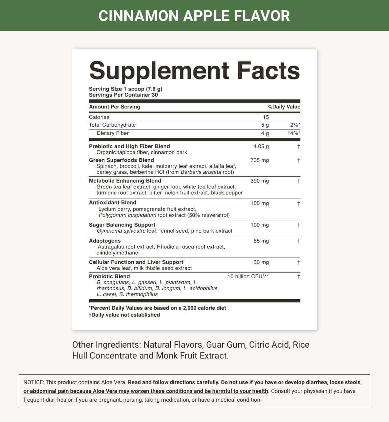 - Prebiotics from cinnamon bark and tapioca fiber.