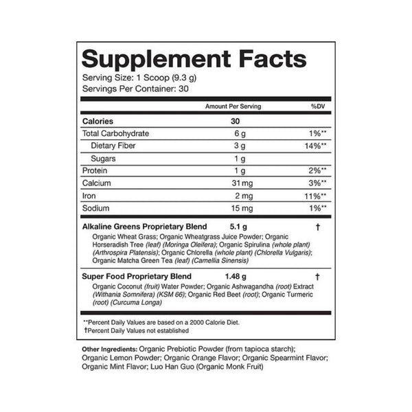 The proprietary “Alkalizing Greens Blend” (4.2g) contains a mix of nutrient-dense greens and superfoods designed to support alkalinity and overall wellness. Since all ingredients in this blend total 4.2 g, individual ingredient amounts are relatively small compared to the main ingredients above: