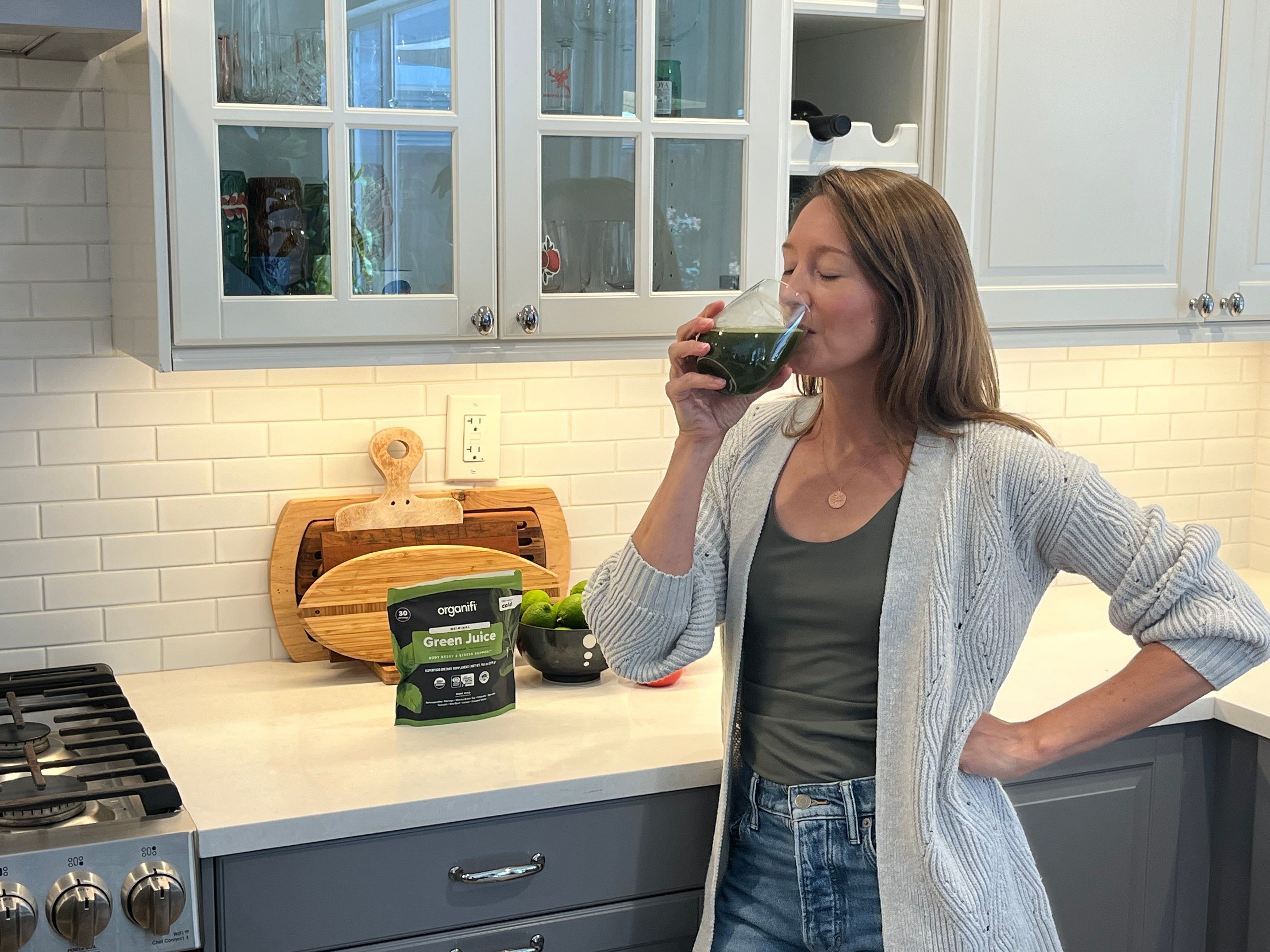 Green powders can be a great way to boost your nutritional intake. Organifi Green Juice includes an alkalizing green blend with nutrient-dense ingredients, such as organic wheat grass powder, spirulina, and chlorella.