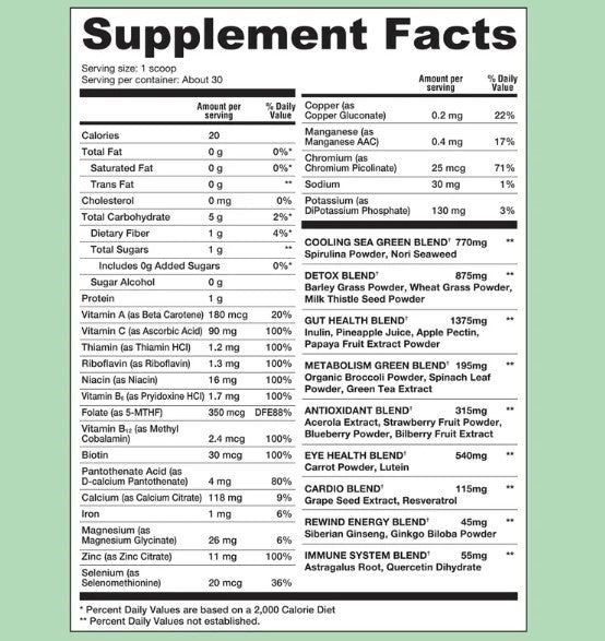 Though their formula touts inulin for prebiotic fiber, Rewind offers just one gram of dietary fiber per serving, which is just 3% of the daily recommended value of 25-30 grams. If you enjoy plenty of other fibrous fruits and vegetables, then using a greens powder with just one gram might work for you. However, on its own, the dietary fibers present are certainly on the lower end of what's typically found in super green powders.