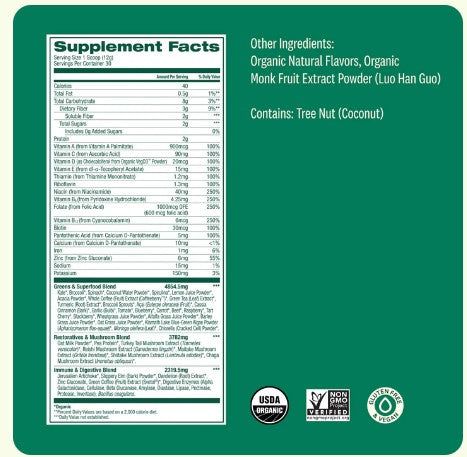 - Features 40+ nutrient-dense greens, veggies, fruits, and functional mushrooms