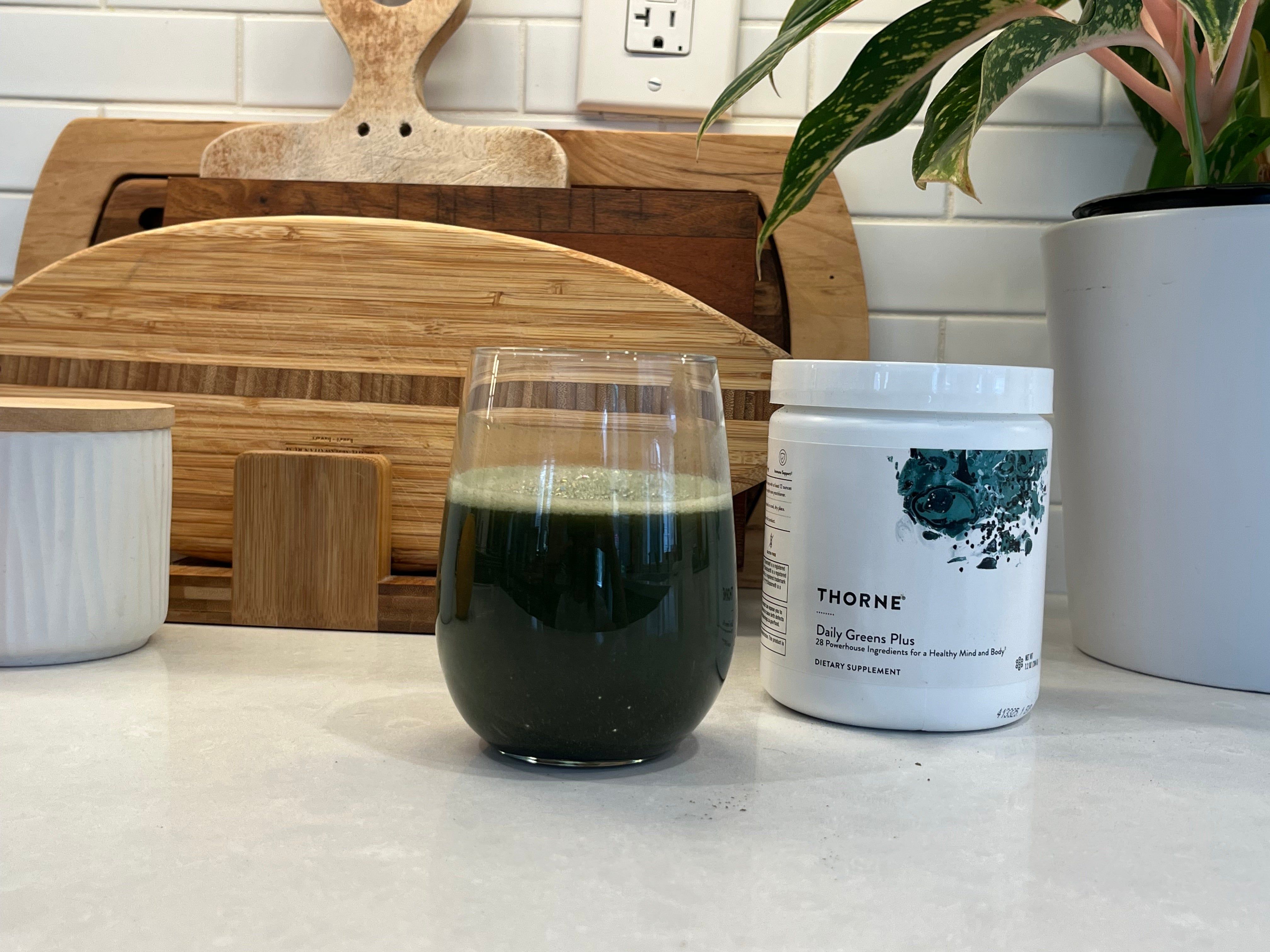 While Thorne sells a variety of products, for our purposes, I'm focusing on the Daily Greens Plus, a greens powder containing 28 powerhouse ingredients in their most absorbable forms.