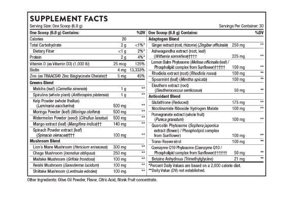 28 powerhouse ingredients, including a greens, mushroom, adaptogen, and antioxidant blend