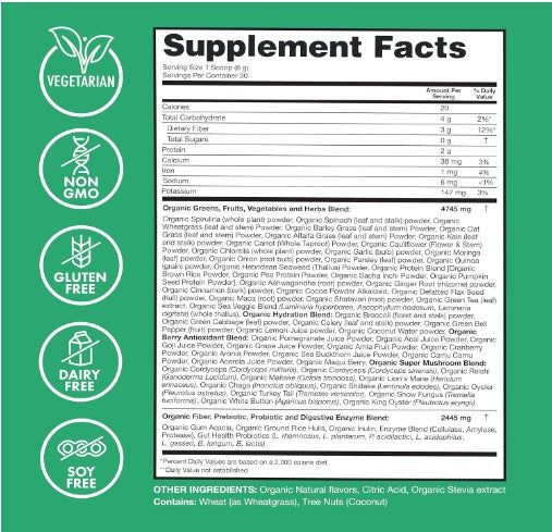 The Super Greens formula is all-natural, vegan, non-GMO, and allergen-friendly (no dairy, gluten, soy, or nuts). It’s also free from added sugars, artificial sweeteners, preservatives, caffeine, and stevia.Â