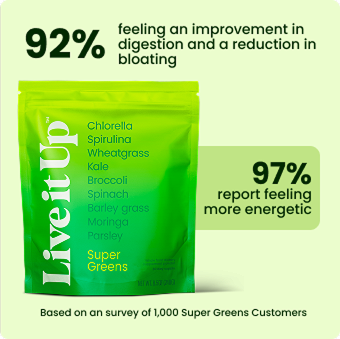 Live it Up Super Greens is a daily superfood powder made with over 20 nutrient-dense greens, grasses, algae, and herbs and is naturally rich in plant-based antioxidants and essential nutrients. Designed to support gut health, digestion, immunity, and natural energy, it delivers clean, whole-food nourishment in every scoop. With probiotics and digestive enzymes for better absorption, plus no added sugar and no artificial sweeteners, it’s a refreshing and simple daily ritual.